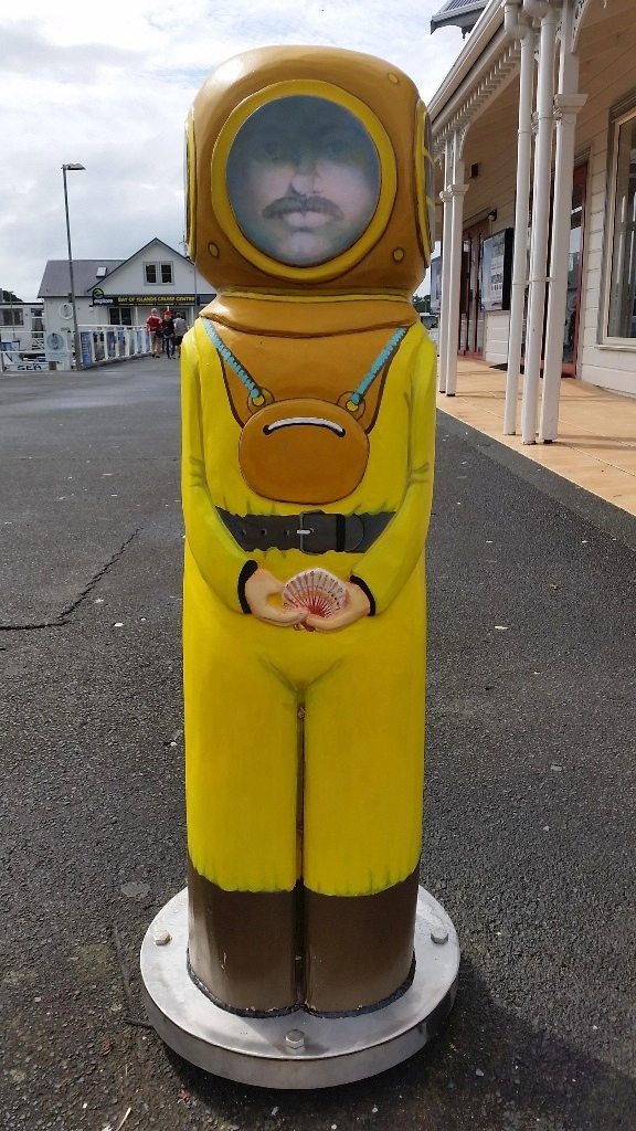 The idea for the bollards came to me at the last Focus Paihia Workshop. We walked through Paihia in groups and looked at sites which we thought could be made more beautiful without detracting from what is already there. That’s how my bollard idea came to life. I wanted to do another project for Paihia, which I thought might be a small scale one but I needed other people involved, as the project itself would have to be done by experienced crafts people. The first step was to research ideas and find 5 characters which I thought represented Paihia. After much thought and discussion with members of the community we settled on those of a Fish, Fisherman, Wahine, Sailor and a Diver. The next big step was to find the wood, the Carver and the Artist who could paint them. I was so lucky to find DARINA DENALI (33) and NOEL WYNYARD (37), both from Russell. Even better was that at the starting time of the project they were neighbours. After we sourced the timber and Noel started carving the first Bollard, we had to be patient, as the Bollard started to crack. So we decided to give the wood more time to dry. Nearly 8 months later the timber was dry enough to continue. No one else saw the Bollards until we had finished and I loved the look on GRANT HARNISH’s face when he saw them for the first time. Grant helped us to finish the project by solving the challenges with the final step – How to install them. Grant pulled together an A team of volunteers and worked to remove the old bollards and and put the new in place.